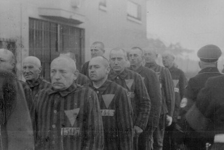 Gevangenen in concentratiekamp Sachsenhausen dragen een roze driehoek (1938). Foto U.S. National Archives
