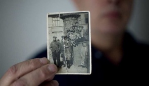 In this photo taken on Nov. 17, 2010, Alex Werber displays a photo his mother kept of her father, fourth from right.