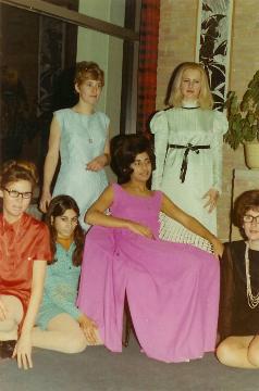 Groep 4 op weg naar Friesland,vlnr.: Martha Pos, Belle Bierenhak, mevr.Ro Cohen (hoofd huishouding), Yvon Godschalk, Carmilla Fuldauer, ?, Esther Smilde in kimono en in witte trui Henny Koopmans