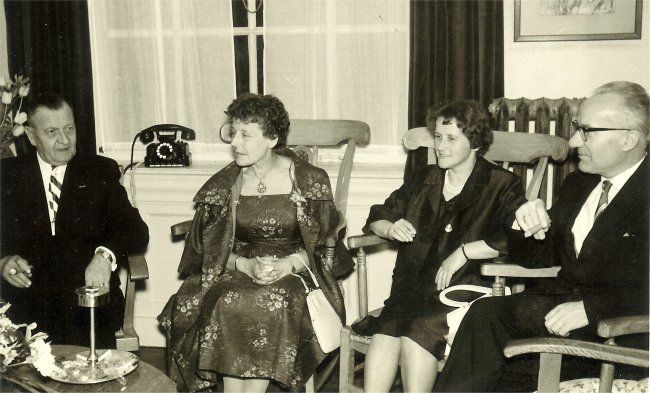 In het raam van de Paddestoel. v.l.n.r.:Hetty ten Berge, Margriet van de Kar, Gerda den Besten (leidster) en Guus Koetsier.