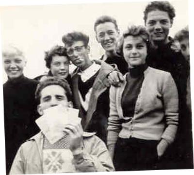 rechts boven Hans Polk, Flip Laus in het midden en Dave Verdooner met de kaartjes.”Uiteraard waren wij weer voorzien van de meisjes van de camping”